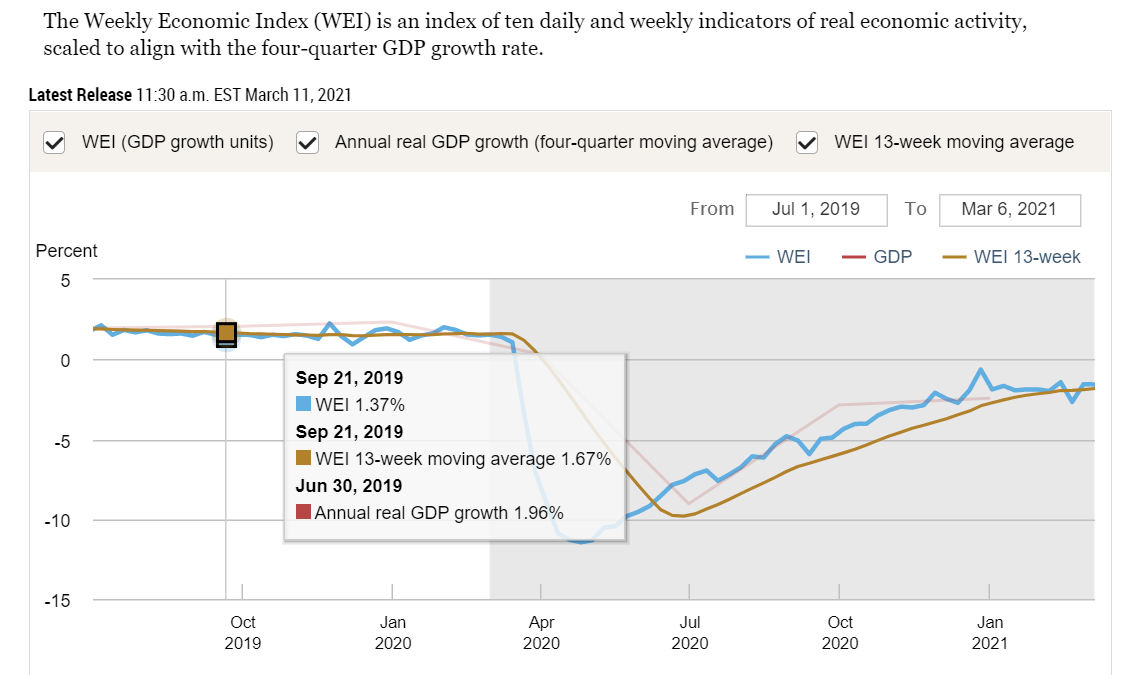 The week was so slow that it generated no updates since Mar 8 to the Federal Reserve Bank of Atlanta's GDPNow nowcast, which I discussed last week and a lot of recent weeks. It has been a while since I've gone back to the New York Fed's helpful gauge of high-frequency indicators they call the Weekly Economic Index (WEI).