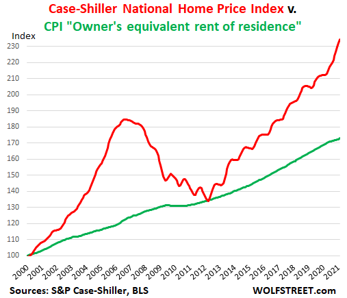 The “owner’s equivalent rent of residence” accounts for 24.2% of CPI. If it had increased by 10.4%, in line with the Case-Shiller index, instead of 2.0%, the overall CPI would have increased by 2.03 percentage points more. So add the 2.03 percentage points to the reported overall CPI increase of 1.7%. And the thus corrected overall CPI would have shot up by 3.7%!