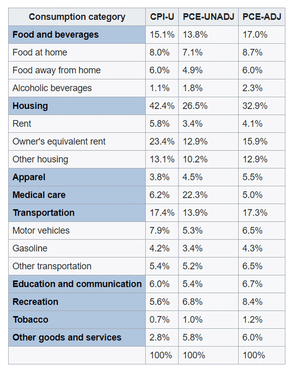 Now, there are actually at least 3 measures of inflation to consider—the Labor Department's CPI and two measures from the Commerce Department's index of Personal Consumption Expenditures (PCE). Take a look at the weightings of all 3, courtesy of Mauldin, by way of Wikipedia, by way of the source agencies; pay attention to differences across the columns.