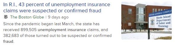 A little short of a majority in Rhode Island, but I swear I heard the "more cases fraudulent than not" stat for one state or another somewhere recently, probably on NPR. Here's the top story at this moment in a local news outlet from Maryland; it looks pretty informative: "Unemployment Mess—The Real Story"
